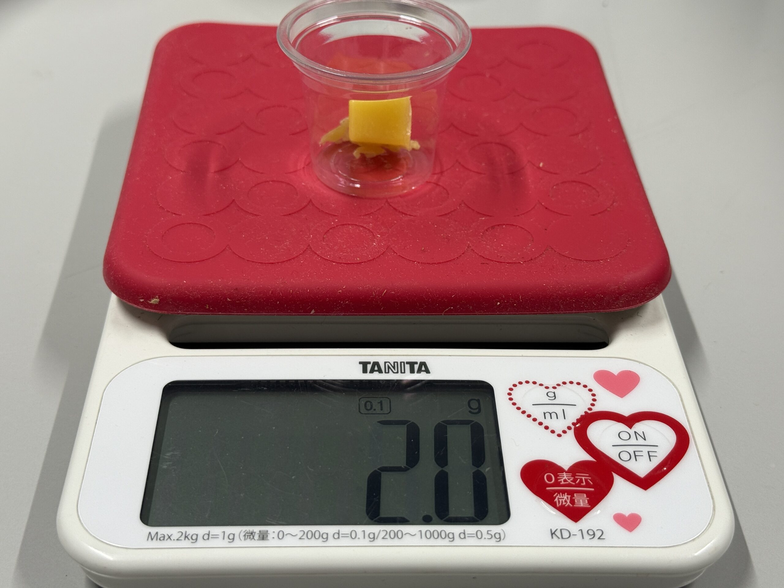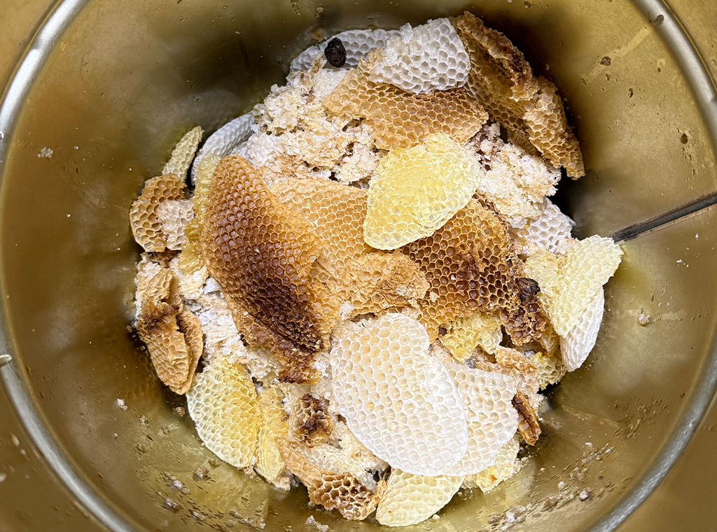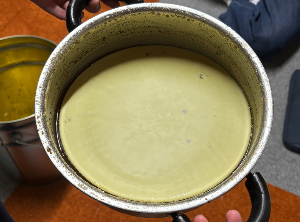 次に、細かいゴミを取り除くために、今度はガーゼを使って再精製を行いました。当初、コーヒーのペーパーフィルタも試してみたのですが、目が細かすぎて、液体の蜜蝋が濾される前に冷えて固まってしまいました。いくつか方法を試した結果、ガーゼが最も適していることが明らかになりました。ガーゼで濾した蜜蝋は、シリコン製の製氷皿で冷やして固めました。この2段階の精製を行うことで、不純物のない、鮮やかな黄色の蜜蝋が精製することができました。