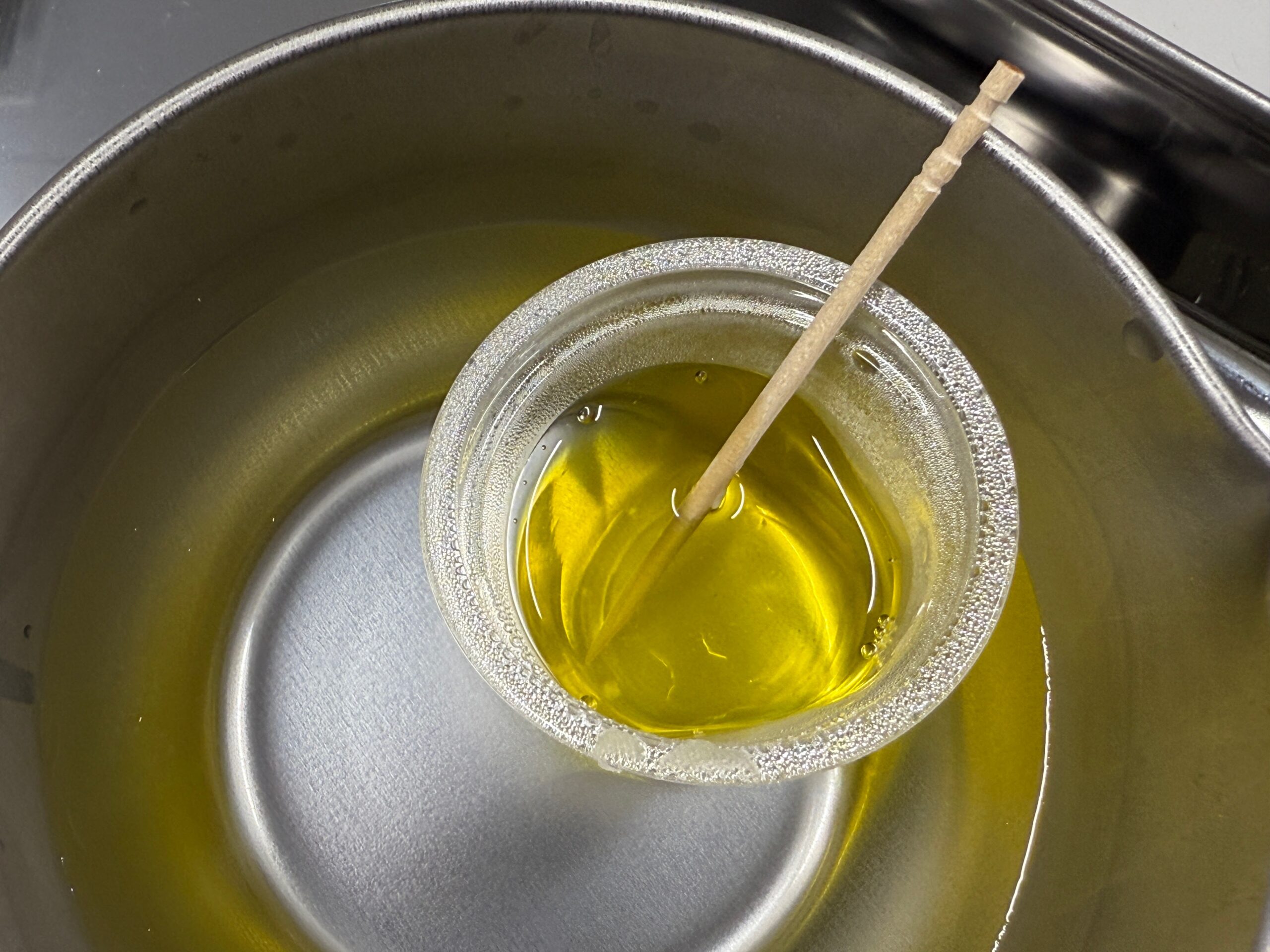 湯煎にかけ、蜜蝋をある程度溶かしてから、キャリアオイル(ホホバオイル)を入れます。再度、蜜蝋が溶けきるまで爪楊枝でかき混ぜます。蜜蝋が完全に溶けきったら、ケースに入れて冷まします。エッセンシャルオイルを入れる場合は、粗熱を取ってから、1~2滴入れます。熱いと香りが飛んでしまいます。